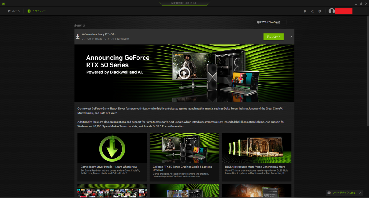 インストールに成功すると、デスクトップにGeForce Experienceというショートカットが作成され、何するのかよくわからない画面が開けるようになります。