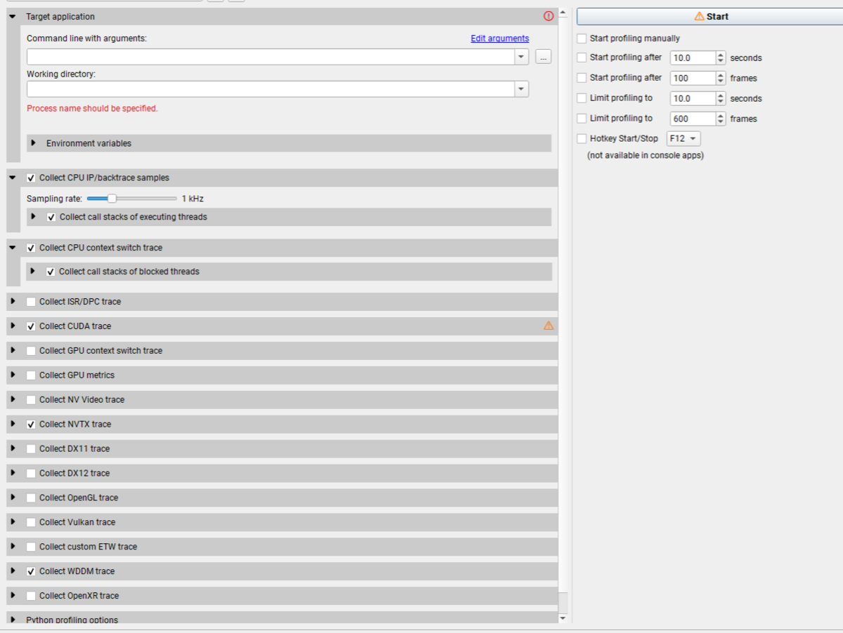 select押すと↓の画面が開かれます。「Command line with arguments」には先ほどのexeファイルを選んで、右の「Start」を押すとプロファイルが実行されます。