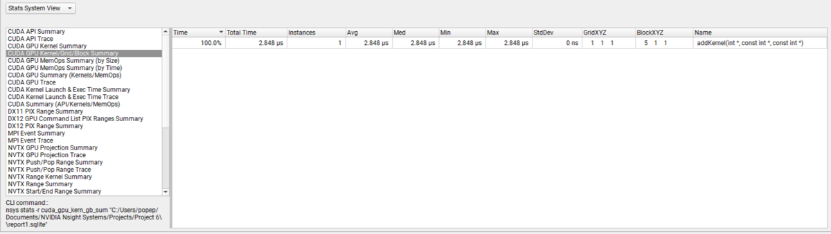 例えば、CUDAをインストールしたときにできてるサンプルコードでは、arraySize=5の計算を行っていました。「CUDA GPU Kernel/Grid/Block Summary」を見ると、グリッドのサイズもx方向が5になっています。他の項目では関数の実行時間なんかも表示されているので、これを使えば最低限の解析ができそうです。