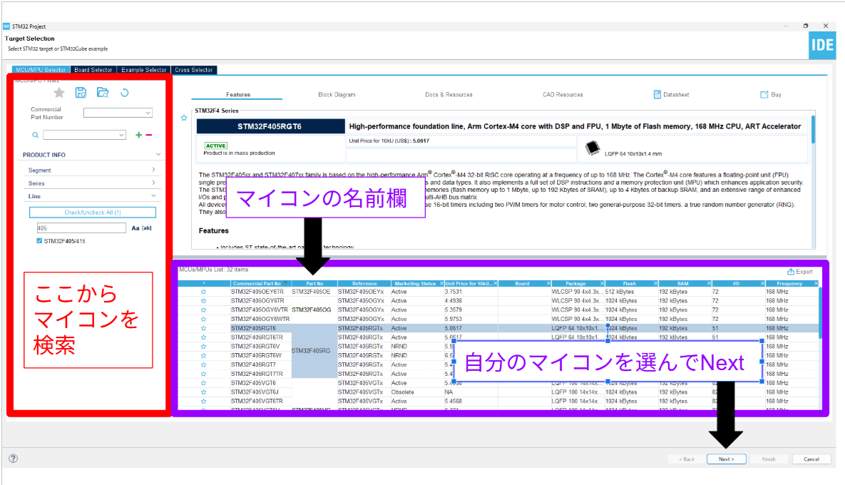 こちらは、使うマイコンを自分で設定しなければいけません。まず、左上の"File→New→STM32 Project"を開きます。画像はプロジェクトを開いた後の画面です。自分のマイコンを検索して、選択します。なお、下に色々な欄がありますが、マイコンの名前はPart No.に書かれており、基本そこだけ気にしておけばいいと思います。