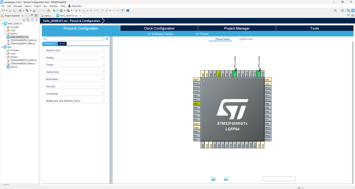 選択して進み、プロジェクト名をつけると、ピンが図示されたマイコンの図がでてきます(ボード全体ではなく、あくまでマイコンの図)。