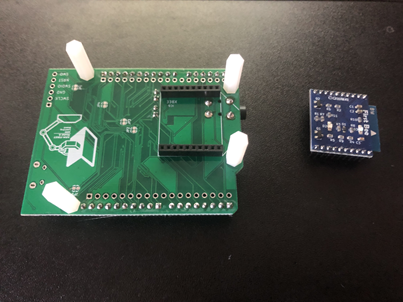 マイコンの背面・合体前。右の青いやつがwifiカードを含んだボードで、左がマイコンボードです。wifiカードのボードの見えない裏側はピンヘッダーがあります。